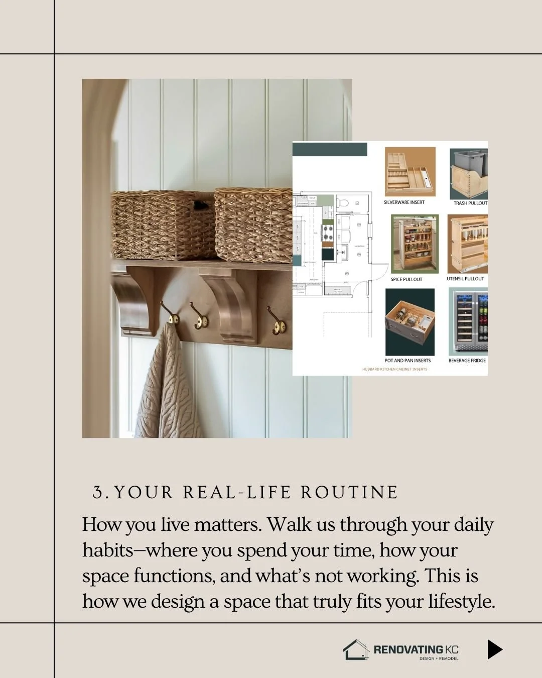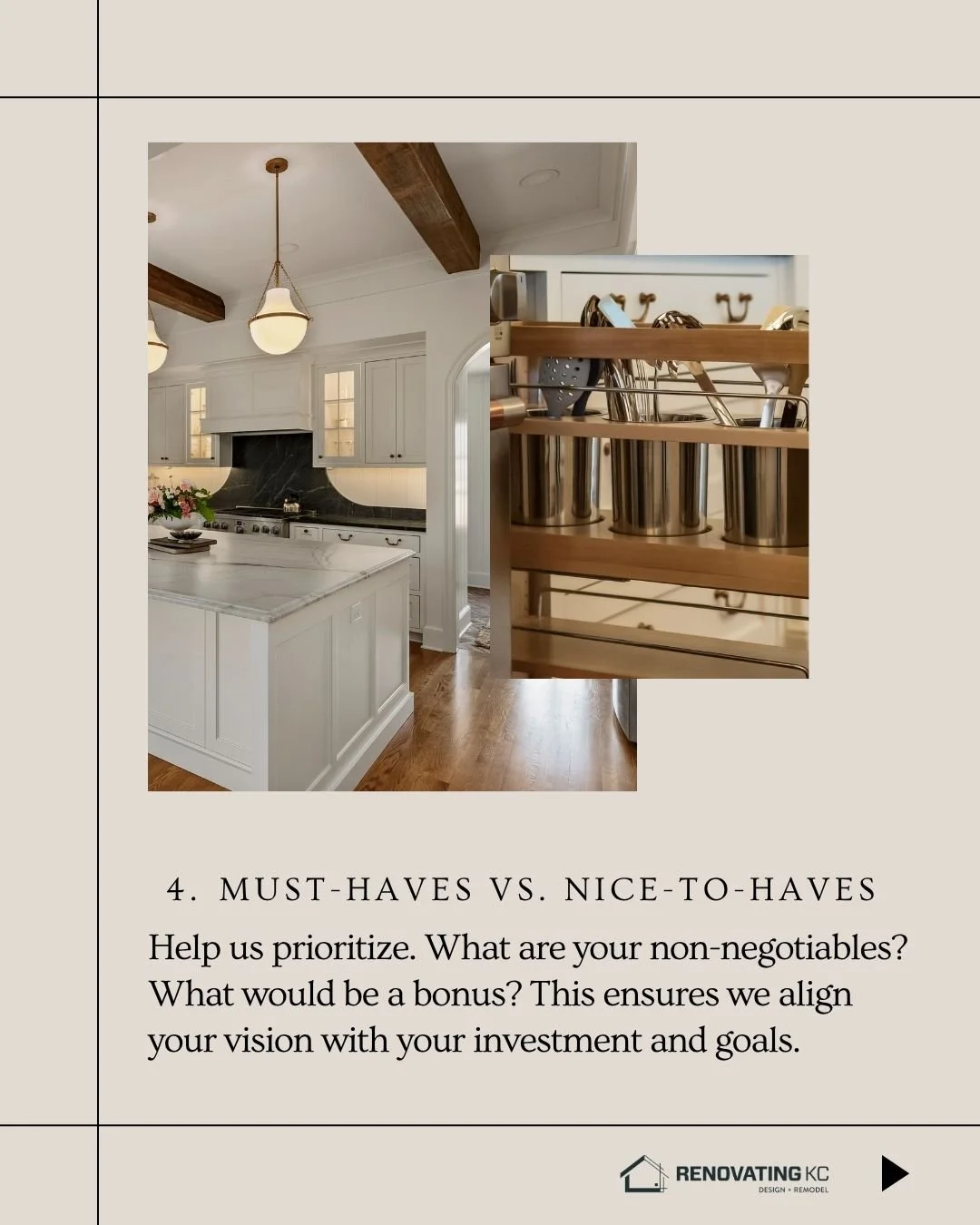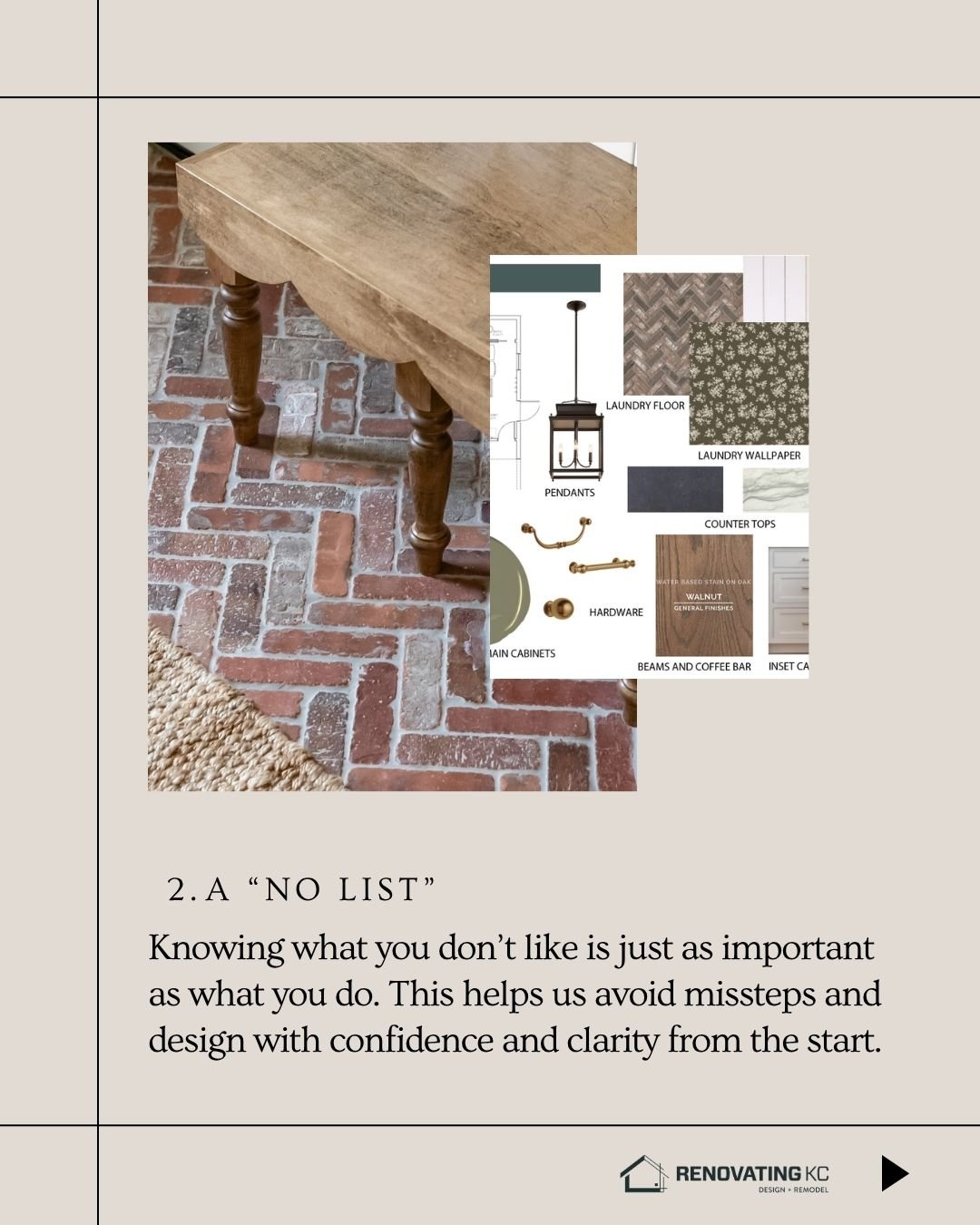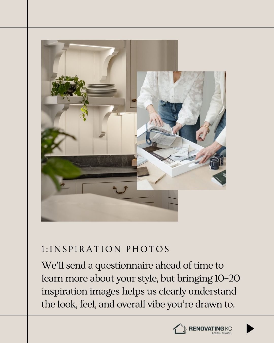 One of the best ways to communicate your vision is through visuals. While our team at Renovating KC will guide you through a design questionnaire, bringing your own inspiration photos helps us quickly understand your style.