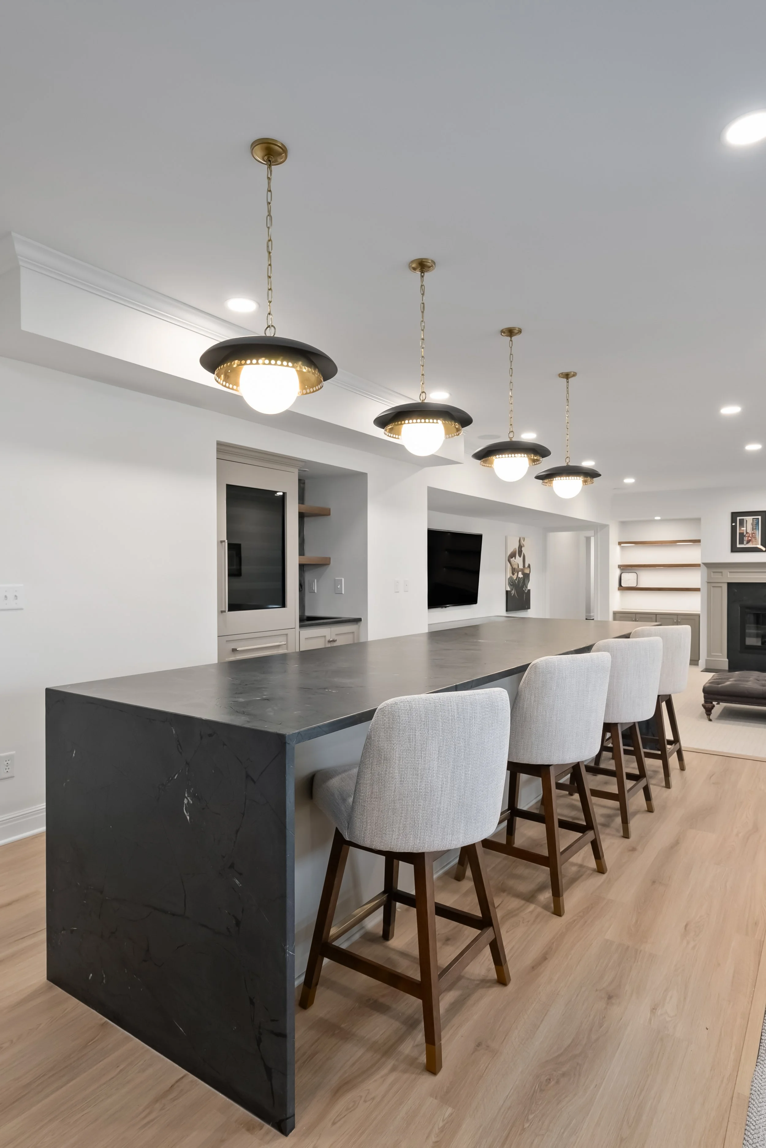 This space now includes a full basement bar, media area, and dedicated zones for both adults and kids.
