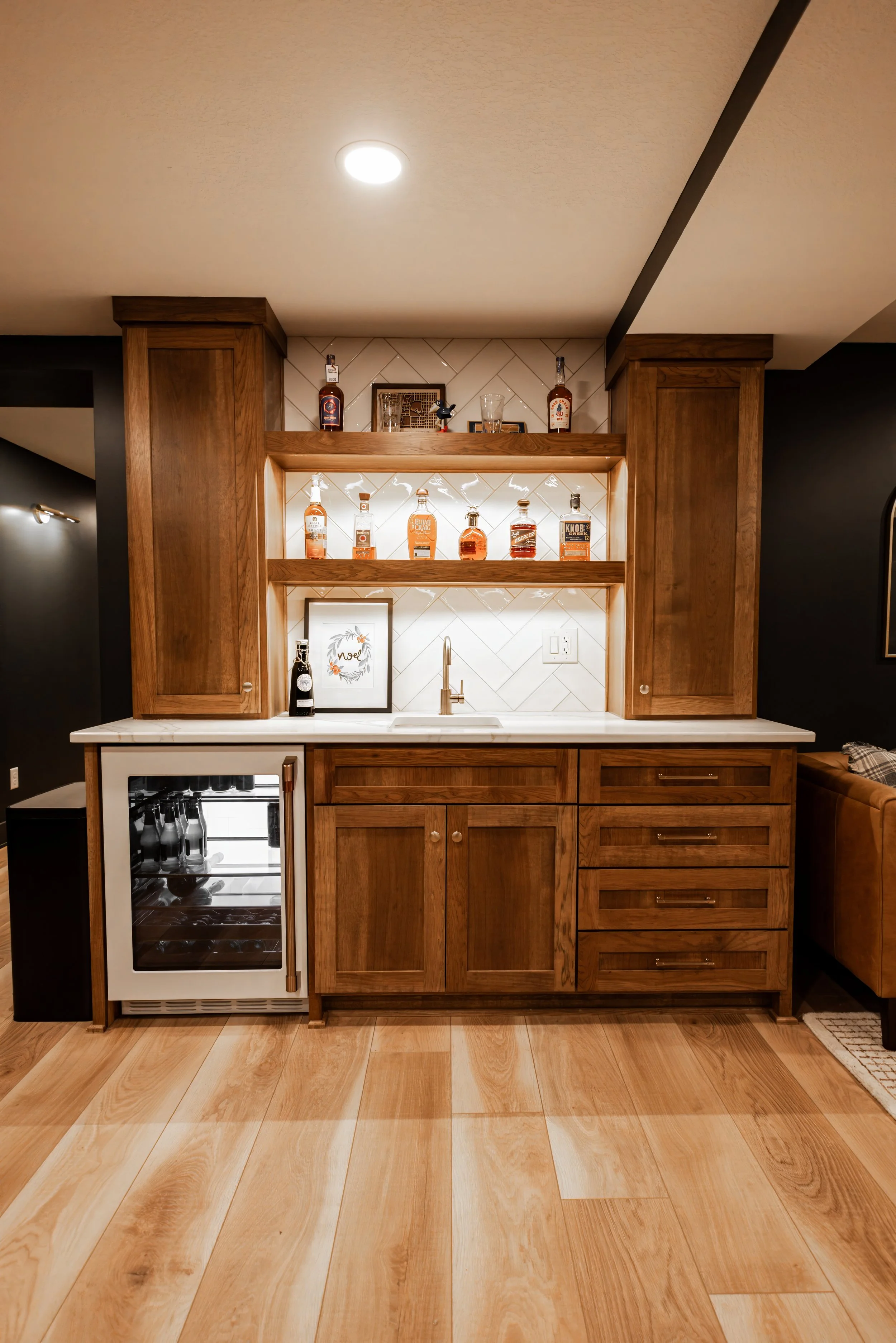 This once unfinished basement was transformed into a warm, inviting space designed for both relaxation and entertaining. The new layout includes a cozy family room, custom-built bar, and a dedicated area for hosting guests.