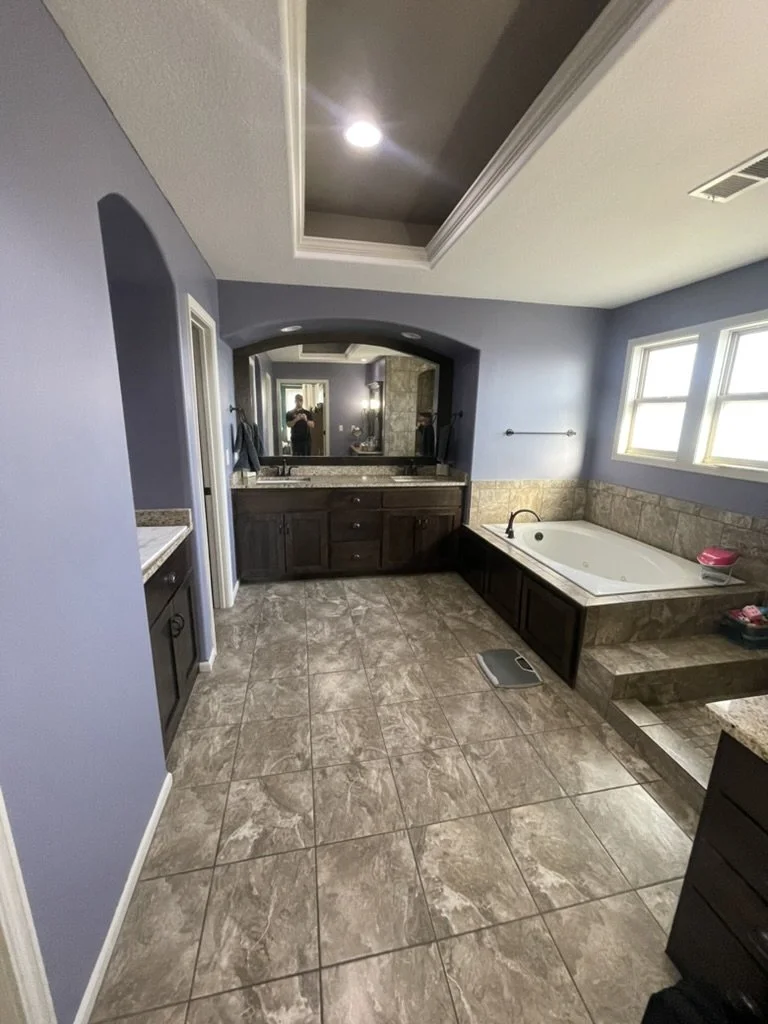 The wish list for this customer was to keep their existing layout, add new tile, additional storage, new plumbing fixtures. Their design inspiration was to be warm and timeless.